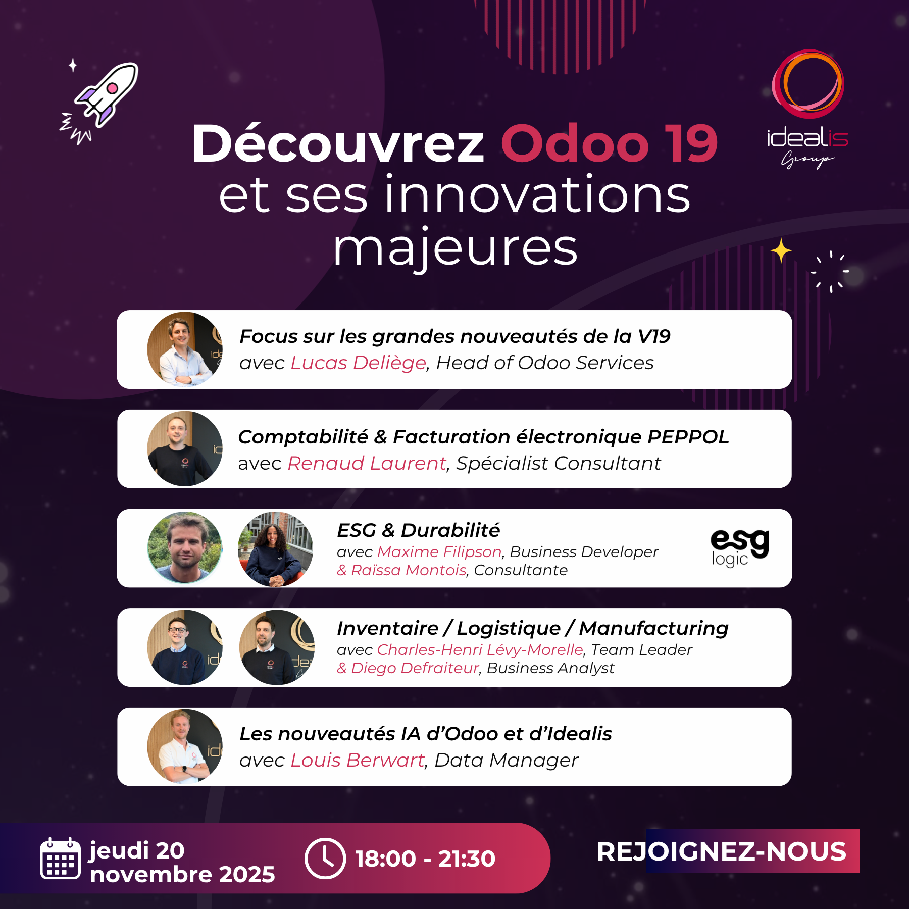 Rejoignez-nous pour un événement exclusif où nos experts Idealis vous feront découvrir les nouveautés les plus marquantes d’Odoo 19, celles qui vont simplifier votre travail et booster votre performance.
